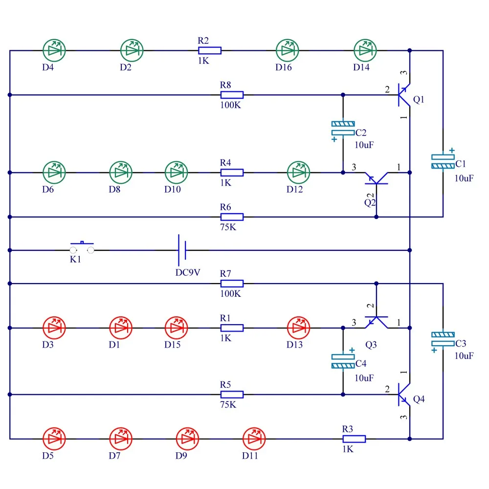 Installasiestappe (Wees asseblief geduldig tydens montering!!!): 1>.Stap 1: Installeer 4 stuks 1Kohm Metal Film Resistor teen R1-R4. 2>.Stap 2: Installeer 2 stuks 75Kohm Metal Film Resistor teen R5-R6. 3>.Stap 3: Installeer 2 stuks 100Kohm Metal Film Resistor teen R7-R8. 4>.Stap 4: Identifikasie-LED. Die Langer pen is positiewe pool. Die langer pen word in die pad geplaas wat ' + ' gemerk het. 5>.Stap 5: Installeer 8 stuks 5mm Rooi LED by D1,D3,D5,D7,D9,D11,D13,D15. Buig die LED terselfdertyd. 6>.Stap 6: Installeer 8 stuks 5mm Groen LED by D2,D4,D6,D8,D10,D12,D14,D16. Buig die LED terselfdertyd. 7>.Stap 7: Installeer 4 stuks TO-92 S8050 Transistor by Q1-Q4. 8>.Stap 8: Installeer 4 stuks 10uF 50V Elektrolitiese Kapasitor by C1-C4. Gee aandag om tussen positief en negatief te onderskei. Die Langer pen is positiewe pool. Die langer pen word in die pad geplaas wat ' + ' gemerk het. 9>.Stap 9: Installeer 1pcs KF-301-2P 5.08mm Connect Terminal by J1.(KF-301-2P hoef nie geïnstalleer te word as dit deur batteryboks voorsien word nie) 10>.Stap 10: Installeer 1pcs Self-locking Switch at K1. Gee aandag aan die installasie rigting. 11>.Stap 11: Installeer 1 stuks 9V Battery Box. 12>.Stap 12: Maak batteryboks vas met 3 stuks M3*6mm skroef. 13>.Stap 13: Koppel aan kragtoevoer en geniet die effek.