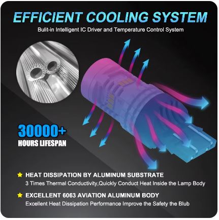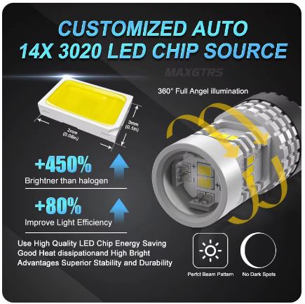 2PC LED high power LED CHIP on top 12pcs LED high power LED CHIP on side Voltage:DC12V-24V Beam Angle:360 Degree All Aluminum construction Replacement for stock output halogen light bulbs Simple installation (No Modification needed) life Expectancy: 20000 hour