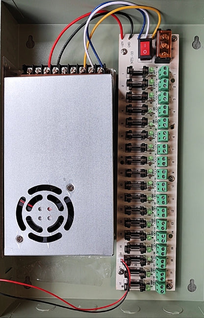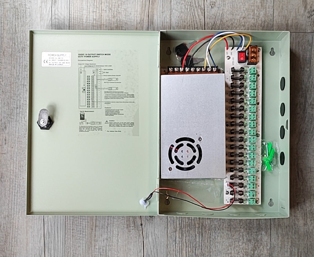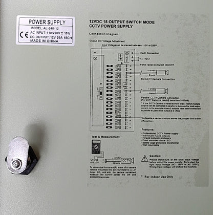The 12v 20 Amp 18CH Power Supply with Metal Enclosure is a reliable and efficient power supply solution for various electronic devices. With 18 channels, it can provide stable and regulated power to multiple devices simultaneously. The metal enclosure ensures durability and protection, making it suitable for both indoor and outdoor use. This power supply is designed for easy installation and comes with built-in safety features such as overcurrent and short circuit protection. It operates on a 12-volt input and delivers a maximum output of 20 amps, making it ideal for LED light strips, CCTV cameras, and other electronics requiring a 12-volt power source.