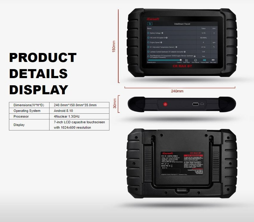 The iCarsoft CR Max BT is a powerful multi-brand diagnostic tool designed to provide comprehensive vehicle diagnostics for multiple systems. With its advanced features and Bluetooth connectivity, this tool allows users to easily diagnose and troubleshoot problems in various vehicle brands and systems, including engine, transmission, ABS, airbag, and more. Equipped with an intuitive user interface and a large color display, the iCarsoft CR Max BT provides real-time data, DTC definitions, and graphing capabilities, making it an essential tool for professional mechanics and car enthusiasts. Whether you need to perform basic maintenance or complex repairs, this diagnostic tool is a reliable and efficient choice.