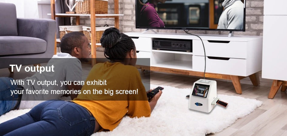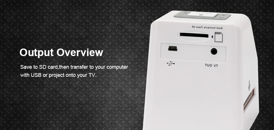 Once you’ve scanned a film, hit the main button to instantly save to your SD card. Images are saved to the internal memory (128MB)or SD card. Transfer the photos to your computer with USB, These can then be viewed on your computer or other devices, or printed out as regular photos. Or project onto your TV to view on a larger screen with your family.