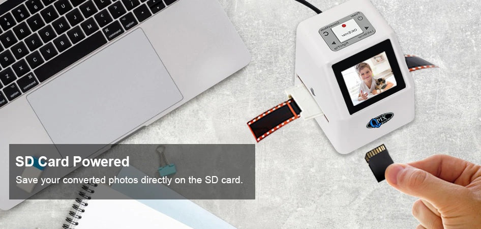 The white film to digital converter transfers your old film/slides to internal memory or SD card (up to 32GB, not included) and supports adjusting the brightness or color of the image. 128MB of built-in memory, save up some images directly onto the all-in-one converter.