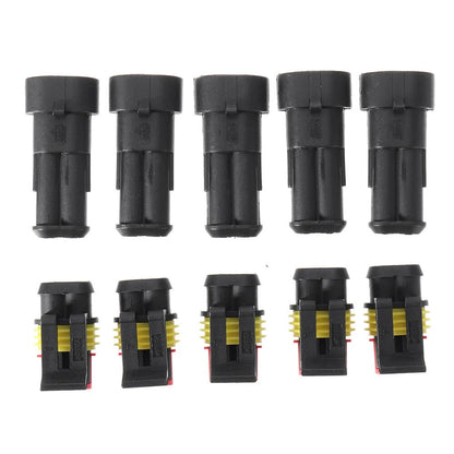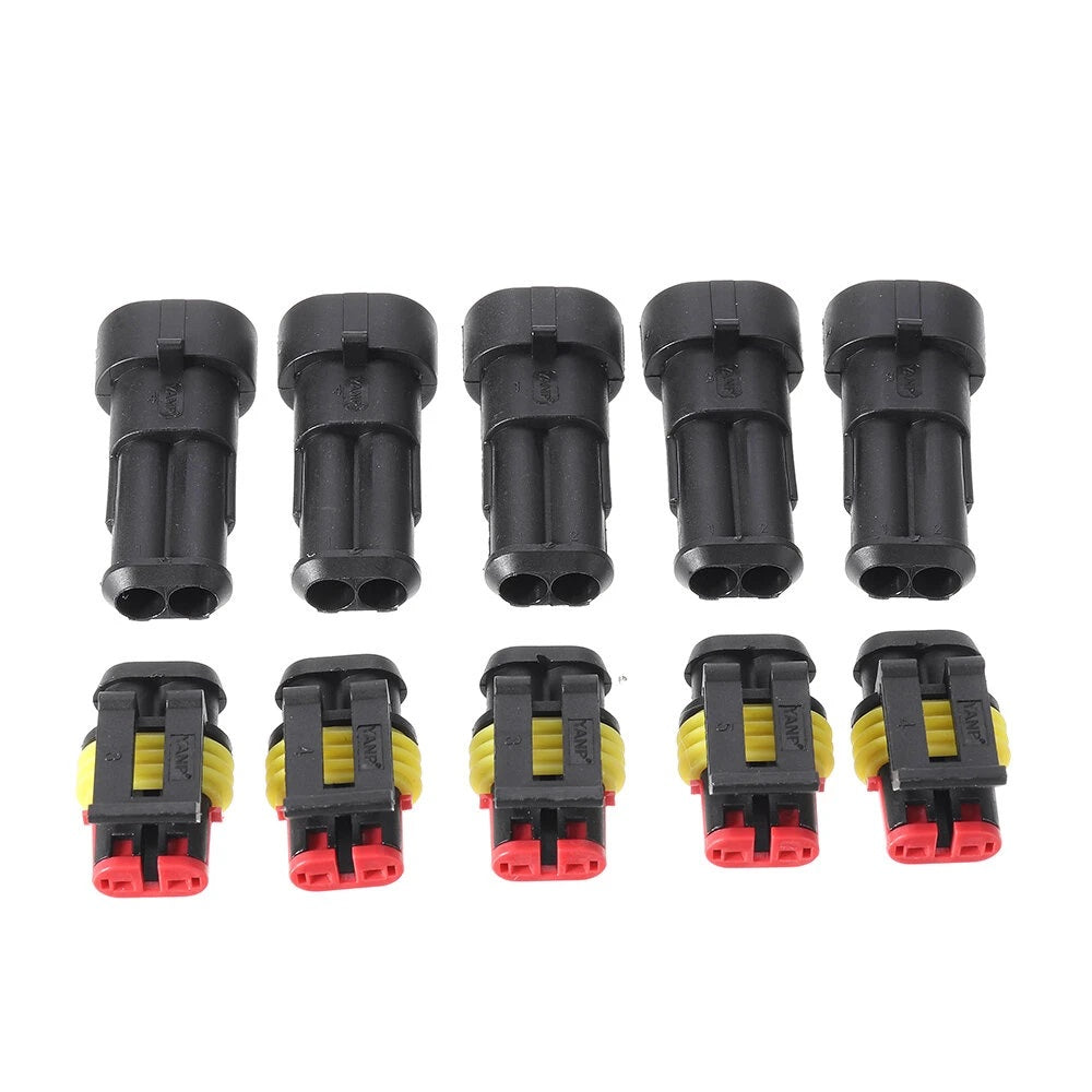 *5 sets of 2 Pins Connectors includes: 5*Male Connector Housings + 5*Female Connector Housings + 10*Male Pins + 10*Female Pins + 20*Silicone Waterproof Plugs
