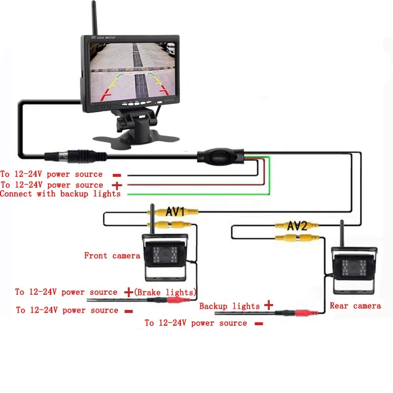 Correct understanding of wireless cameras: 1. There is no wireless network connection between the screen and the camera. 2. You cannot see two cameras on the monitor at the same time, you can only see the image of one or the other camera. 3. First press the AV1 / AV2 channel button on the monitor, and then press the second flip button of the monitor to adjust the frequency band. When the frequency band of the camera is the same as that of the monitor, the image will be displayed automatically.